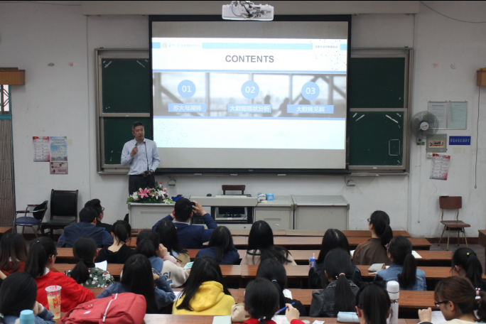 为进一步提高我院2015级数学类专业学生的专业认知与考研热情,帮助其拓宽专业领域的相关知识,了解更多苏州大学数学专业的考研信息。4月26日,在苏州大学数学学院考察团一行到访5357cc拉斯维加斯之际,苏大数学院大数据培训中心主任朱建刚教授在1幢115教室进行了题为“大数据产业现状与人才需求”的专题讲座,并进行了考研宣讲。