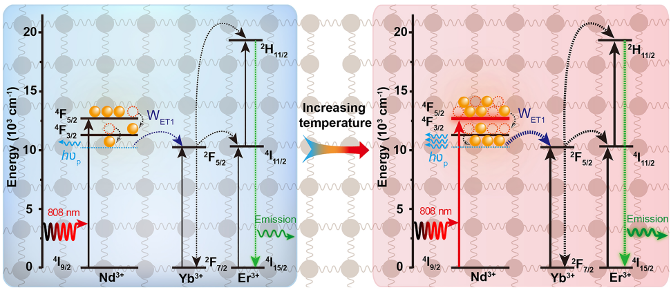 庞涛博士等人设计一种与激发波长有关的策略,从理论和实验上证实声子辅助能量传递(主导)和跃迁截面(次要)的热增强可以有效克服声子的热增强布居对发光的不利响应,首次在热膨胀的NaGdF4基质中基于非表面策略实现抗热猝灭的上转换发光,为相关材料在温度响应动态防伪、生物温度传感以及纳米光加热器等方面的应用研究提供了重要参考。