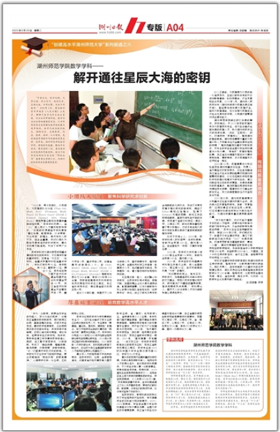 2022年9月20日,《湖州日报》A04版以“湖州师范学院数学学科——解开通往星辰大海的密钥”为题推出“创建高水平湖州师范大学”系列报道之六,整版报道我校数学学科。具体如下: