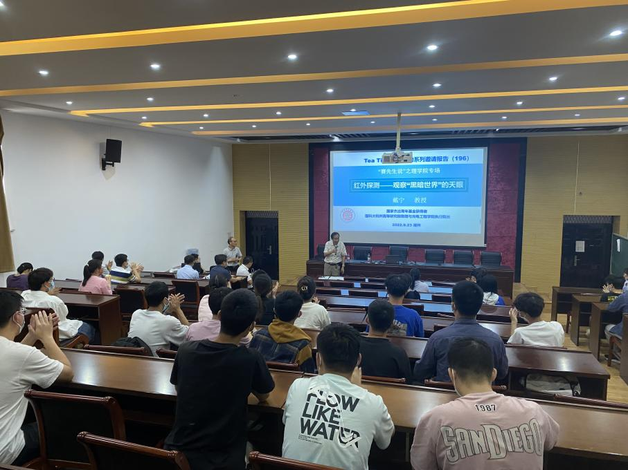 戴老师结合他在红外光谱领域的丰富研究经历和研究成果,由一个黑体辐射公式出发,由浅入深,介绍了不同温度物体的辐射规律、探测难点、以及探测技术在科研、军事、航天等领域的发展现状和未来挑战,鼓励青年科技人员树立远大的目标,不断探索,勇攀科学高峰。在最后的提问环节,师生们踊跃提问,关于专业知识、科研人的初心等问题,戴老师细致耐心地一一进行了解答。