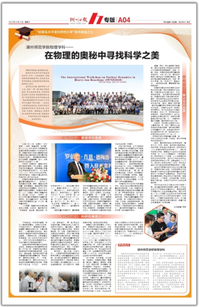2022年10月12日,《湖州日报》A04版以“湖州师范学院物理学科——在物理的奥秘中寻找科学之美”为题推出“创建高水平湖州师范大学”系列报道之七,整版报道我校物理学科。具体如下: