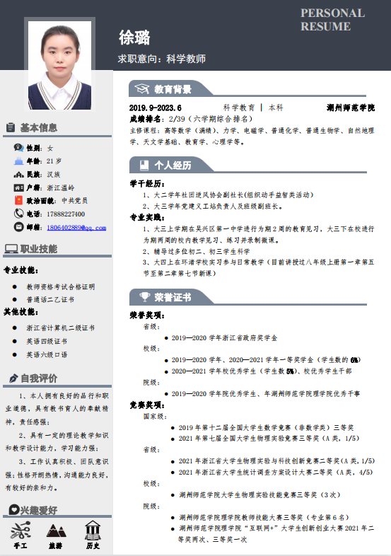 展青春风采,为职场赋能。参赛选手围绕个人信息、求职意向、教育背景、职业经历、荣誉奖项、兴趣爱好六个方面展开,并融入自身创意,制作出版面大方、内容条理、设计新颖的个人简历,充分展现出参赛大学生的个人风采。其中,科教专业的徐璐同学制作的简历尤为突出,她结合目标岗位需求,突出相应的知识技能,并锁定关键词语,用较为具体的表达方式叙述自己的实践经历及收获。同时,简历的设计风格大胆创新、配色协调、富有美感,各部分结构合理有序,将自己的优势充分表现出来。评委根据选手的内容进行综合打分,最终,徐璐、柳淳、余晋等5人入围复赛。初赛结束后,同学们纷纷表示此次简历制作大赛对自己未来求职有很重要的意义,今后将加强对于简历的排版和设计等相关知识的学习,注意细节,改进不足之处,进一步提高简历制作的水平。