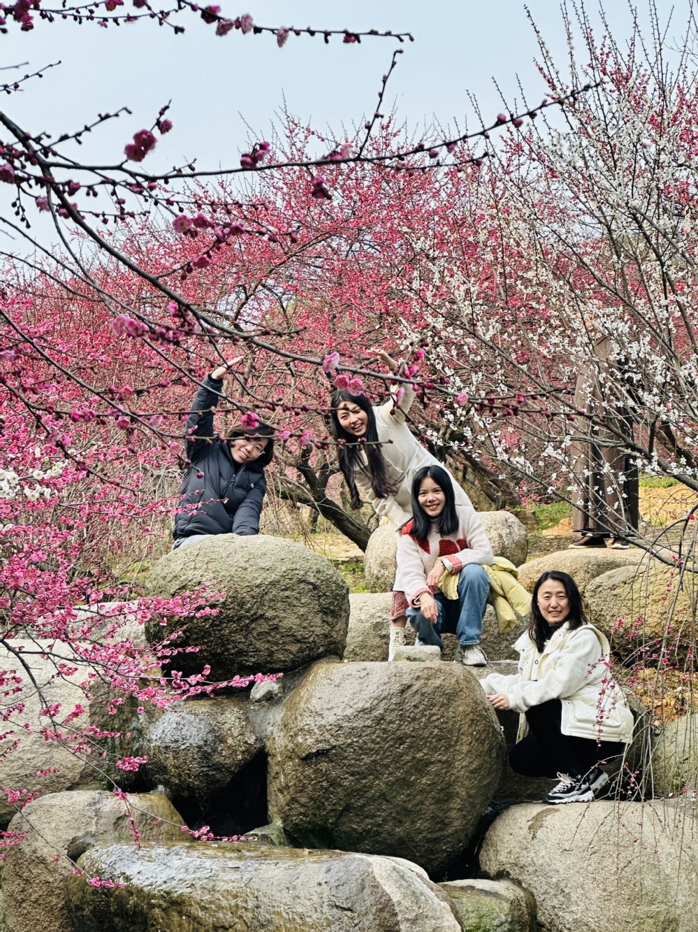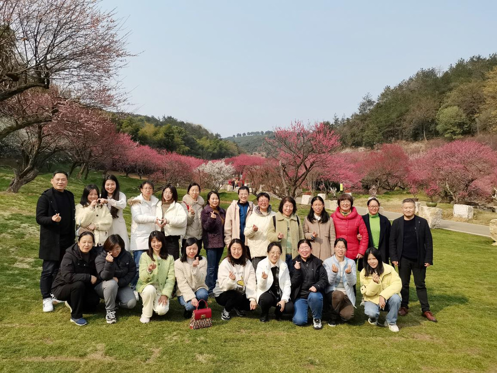 春日将至,百草从时。三月的长兴东方梅园,各色各样的梅花争妍斗艳。奇石与古梅交叉分布,鲜花与古木相映成趣,曲水寒潭点缀点缀其中,满园春色引得女教职工们纷纷驻足观赏。大家漫步于林荫小道上,耳闻鸟鸣,目及春花,尽情沐浴着春日的和煦,呼吸着新鲜的空气,释放平日里积攒的身心压力。观树、赏花、拍照,尽情享受着赏花踏青的乐趣,与春天来一场美丽的约会。