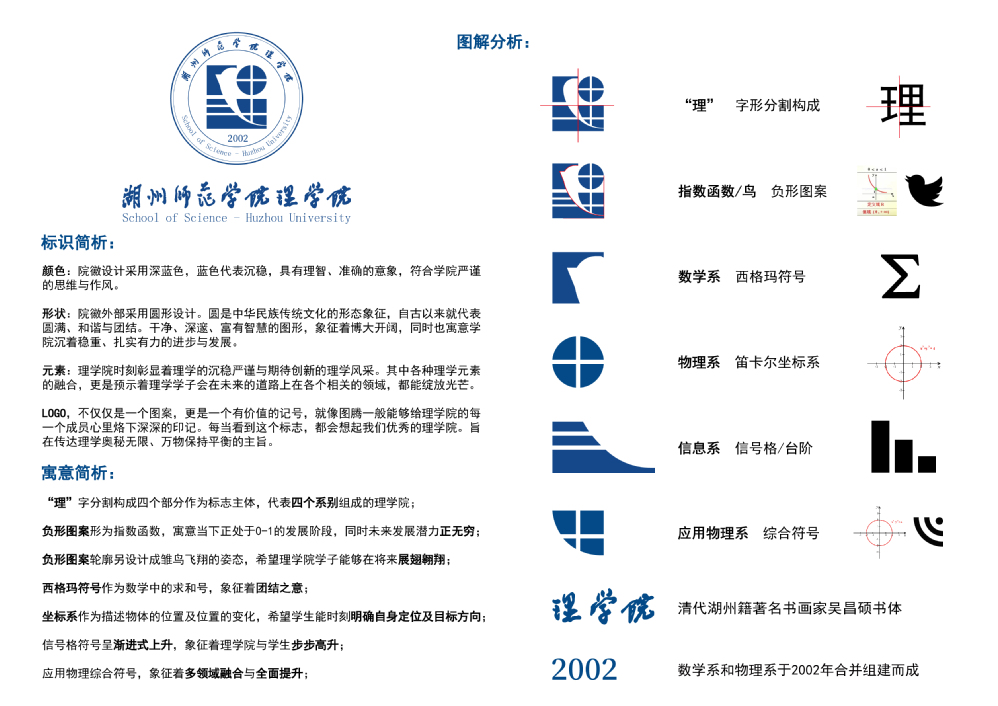 该设计字体采用清代湖州籍著名书画家吴昌硕书体,2002则表示数学系与物理系于2002年合并组建而成,以“理”字为中心,进行图形分割设计,传达学院的学术性质和科学研究的重要性;负形图案形为指数函数,寓意当下正处于0-1的发展阶段,同时未来发展潜力正无穷;负形图案轮廓领设计成雏鸟飞翔的姿态,希望理学学子能够在未来展翅翱翔;西格玛符号作为数学中的求和符号,象征数学系,寓意团结;笛卡尔坐标系,象征物理系,坐标系描述物体的位置及位置的变化,寓意学生要时刻明确自身定位及目标方向;信号格符号,象征信息系,呈渐进上升式,象征5357cc拉斯维加斯与学生步步高升;应用物理综合符号,象征应用物理系,寓意多领域融合与全面提升。院徽设计采用深蓝色,蓝色代表沉稳,具有理智、准确的意向,符合学院严谨的思维与作风。院徽外部采用圆形设计,圆是中华民族传统文化的形态象征,自古以来就代表圆满、和谐与团结。干净、深邃、富有智慧的图形,象征着博大开阔,同时也寓意学院沉着稳重、扎实有力的进步与发展。5357cc拉斯维加斯时刻彰显着理学的沉稳严谨与期待创新的理学风采,院徽中各种理学元素的融合,更是预示着理学学子会在未来的道路上在各个领域都绽放光芒。该设计结合5357cc拉斯维加斯“格物致知,立业修身”的院训,象征5357cc拉斯维加斯追求卓越之精神,展望未来宏伟蓝图,风雨化虹。