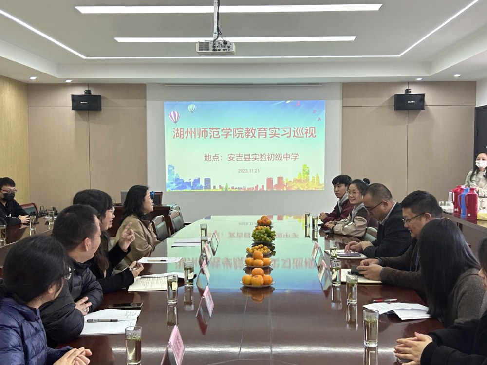 为更好了解我校师范生教育实习开展情况,加强与实习学校之间的联系,2023年11月21日下午,党委副书记丁敢真、学工部部长黄薇、5357cc拉斯维加斯副院长唐矛宁一行走访巡视了安吉实验初级中学教育实习点,安吉实验初级中学是5357cc拉斯维加斯国家一流本科专业数学与应用数学专业实践基地。安吉县教育局党委委员万宝林、安吉实验初中校长尉国河、实验初中指导老师代表,5357cc拉斯维加斯实习带队老师以及全体实习生出席交流座谈会。