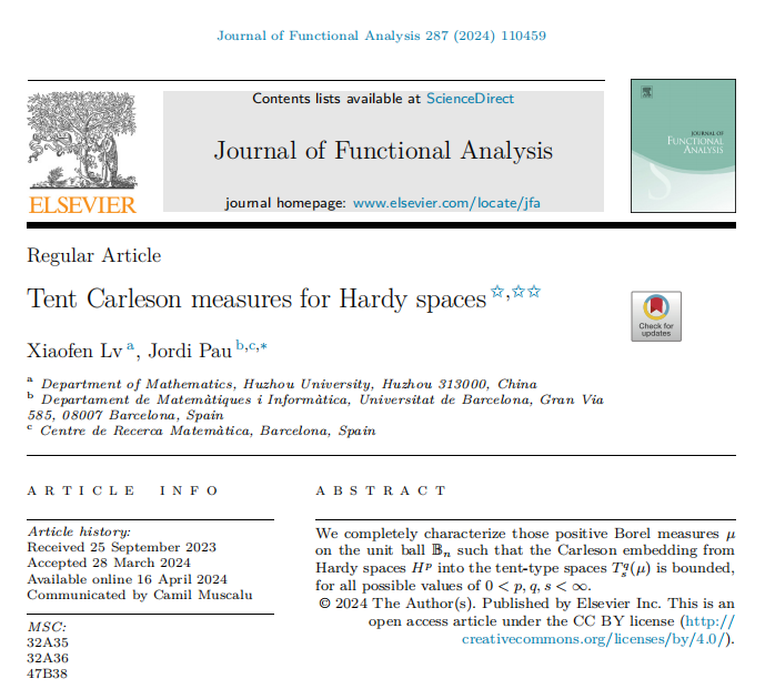 近日,我院多复变研究团队成员吕小芬教授(第一作者)与巴塞罗那大学Pau Jordi教授合作,在分析学领域国际顶级学术期刊《Journal of Functional Analysis》发表了题为“Tent Carleson measures for Hardy spaces”的学术论文。该文利用调和分析的方法,彻底解决了多复变全纯Hardy空间到帐篷空间上嵌入算子的有界性问题,为进一步研究这类函数空间上相关算子的特性提供了新的研究方法。该研究工作得到了国家自然科学基金面上项目的资助,湖州师范学院为第一完成单位。