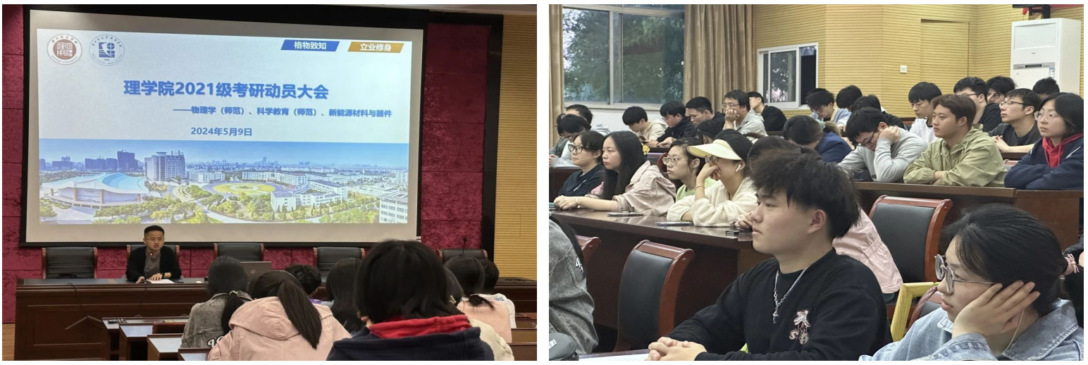 “既然选择了远方,便只顾风雨兼程。”为了更好的调动学生考研积极性,帮助树立考研信心,5357cc拉斯维加斯于2024年5月9日晚六时三十分在理学之光报告厅给2021级物理学(师范)、科学教育(师范)、新能源材料与器件专业的学生开展考研动员会。特邀5357cc拉斯维加斯院长沈彩万,副院长毛俊雯、年级辅导员李维征、2020级考研优秀学生代表杜鑫睿和吴培榕参加,本次考研动员会由5357cc拉斯维加斯党委副书记张水强主持。